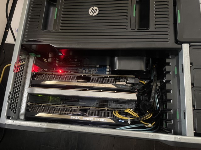 I decided to use an oscillating saw to cut the components and make it fit. This was pretty tedious but in the end it does seem to work well. In the above image the P40 in on the top and the 980 Ti is on the bottom.
